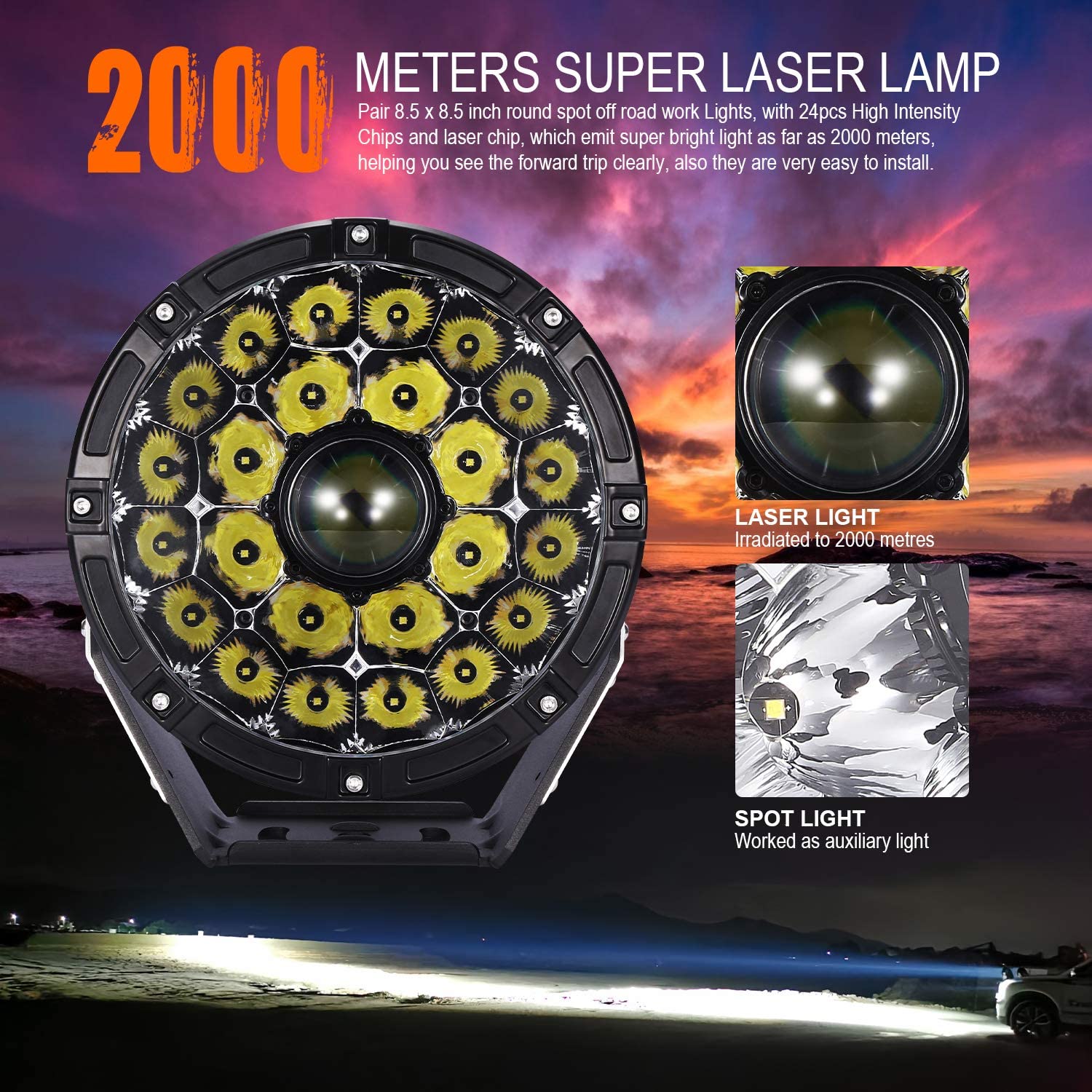 - Pair 9 x 9-inch round spot off-road work lights, with 24pcs High-Intensity Chip and laser chip, which emit super bright light as far as 2000 meters, helping you see the forward trip clearly, also they are very easy to install.