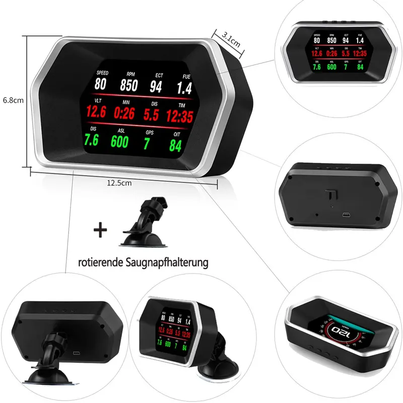 - Display Information: Vehicle speed/water temperature/voltage/fuel consumption/speed/single mileage/total mileage/travel time/travel direction/search stars number altitude/time/intake pressure/oil temperature/air fuel ratio/turbine pressure/intake pressure/acceleration test/brake test/data stream reading