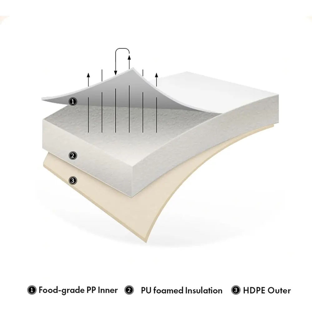 - Food grade material PP Inner, CFC-free PU foamed insulation & HDPE outer material