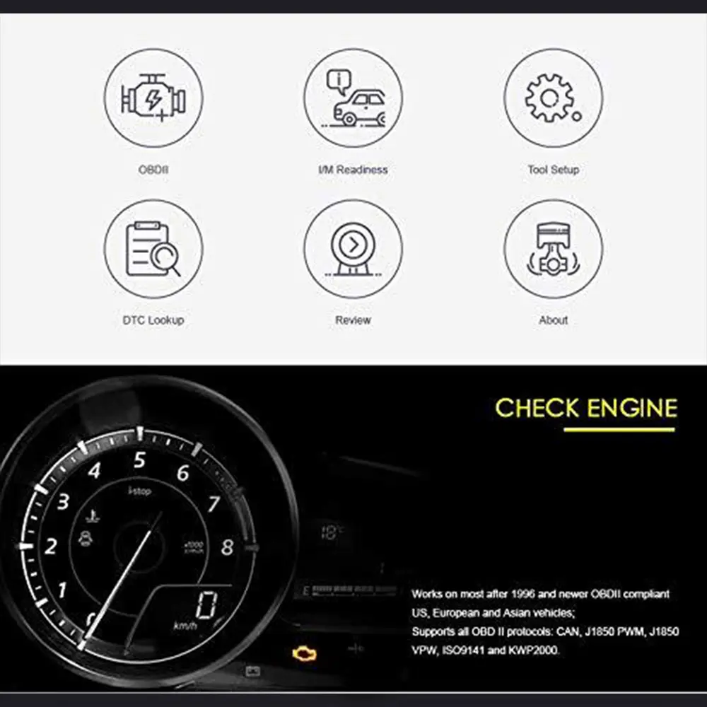 - POWERFUL COMPATIBILITY – Works on most vehicles sold in the USA with model year of 1996 or newer; Supports all OBDII protocols: KWP2000, ISO9141, J1850 VPW, J1850 PWM, and CAN (Controller Area Network); Works with English, German, French, Spanish, Finnish, Dutch, Russian, and Portuguese; It does not require any Battery or Charger. It gets power directly from the OBDII Data Link Connector in your vehicle.