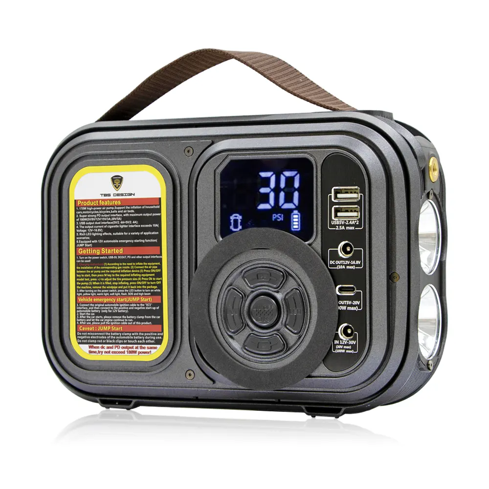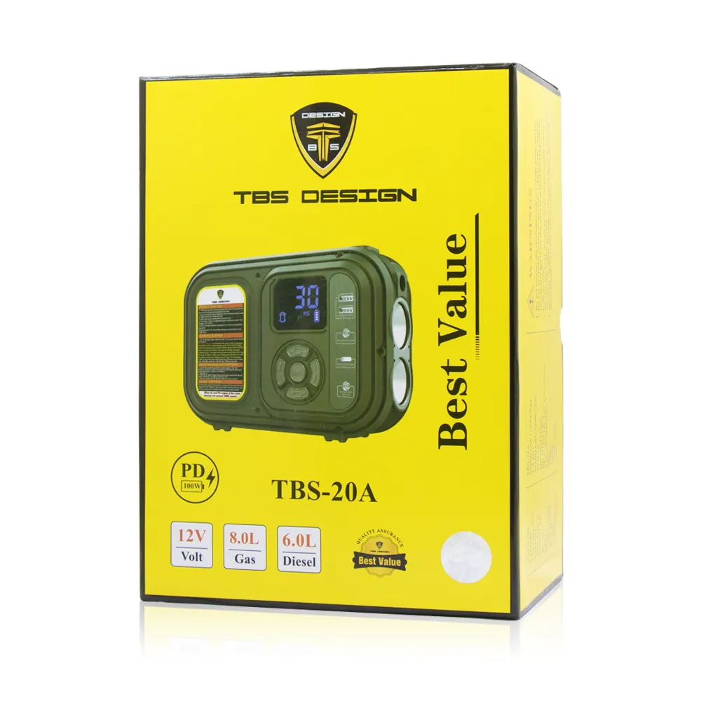 - TBS-20A Inflates tires in 1.5 minutes and jumps any 8L gas or 6L diesel engine with a max 2000A current.