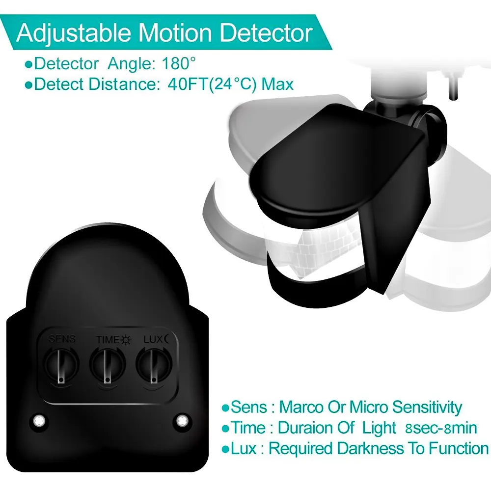 - PIR motion sensor, integrated with the unit, detects any movement at up to 40 feet(under 24 degree celcius) and across 180 degrees Reduced senser range during summer, Waterproof Design.