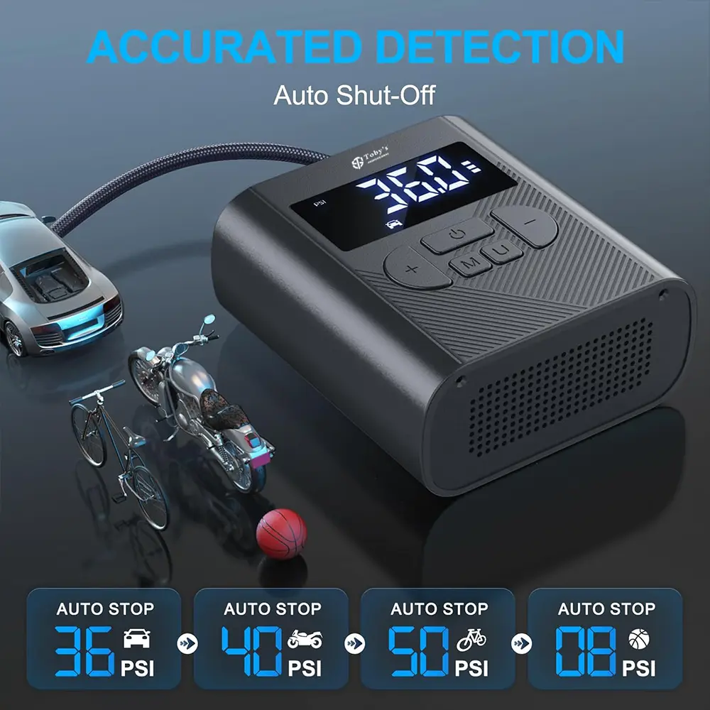 - 【5 Modes, Preset Auto Stop】 5 different inflation modes (Bicycle, Motorcycle, Car, Ball and Custom Mode) allow you to easily switch in different scenarios. Before inflating, you can preset the desired pressure value on the digital display screen. When the inflator detects that the desired pressure has been reached, it will automatically stop to prevent over-inflation.