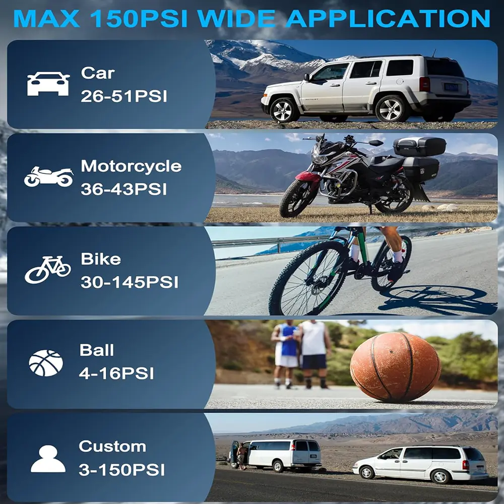 - 【Multifunctional Portable Tire Compressor】 Fast inflation speed and accurate pressure measurement. The air pump provides you with four available pressure units: PSI, BAR, KPA, KG/cm². It also includes various types of nozzles and ball needles, suitable for electric bicycles, bicycles, cars, motorcycles, balls, electric scooters, etc.