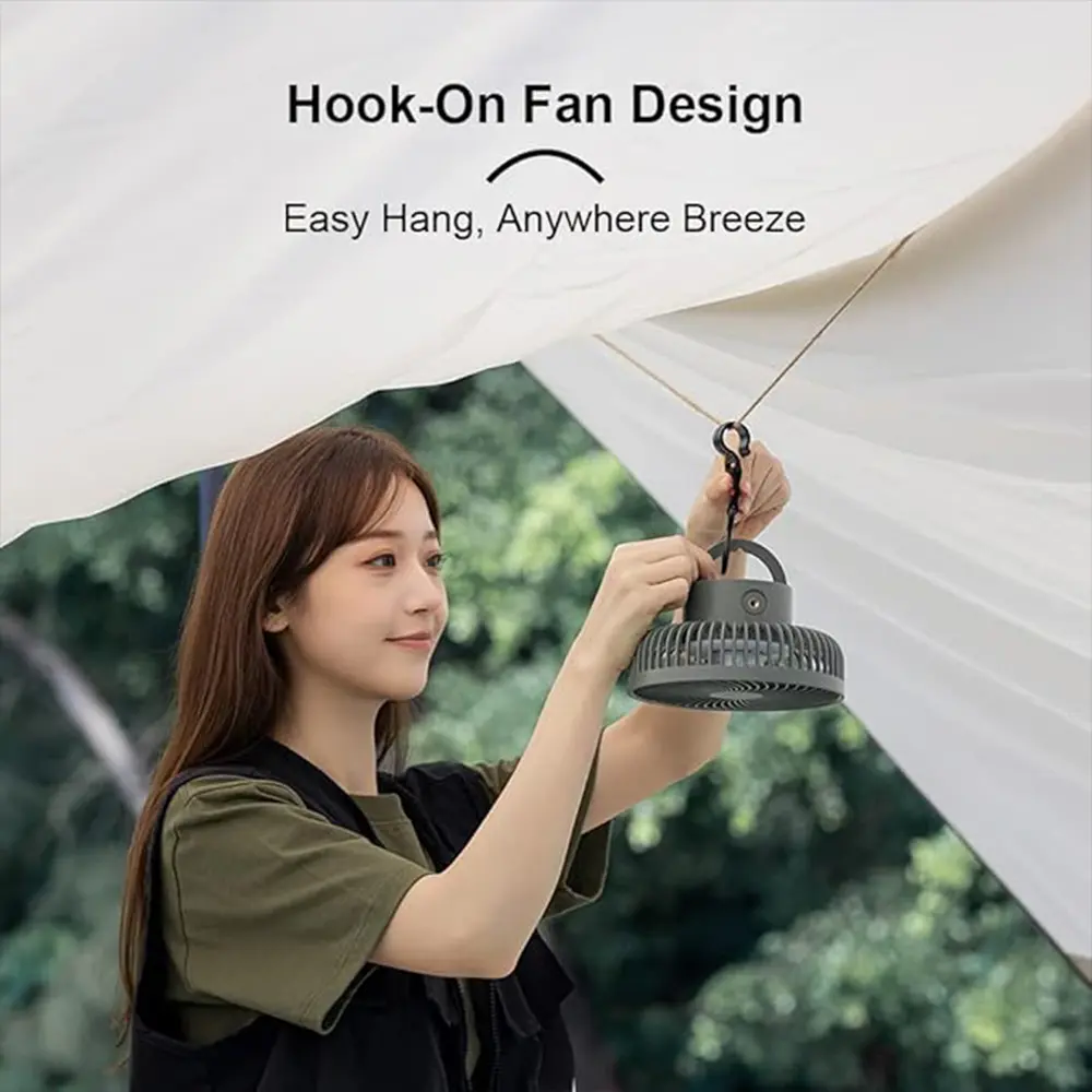Hook-On Design for Easy Breezes: Have you ever wished you could hang your fan from a hook instead of taking up valuable floor or tabletop space? Our innovative hook-on design makes it easy to hang your fan anywhere you need a refreshing breeze. Whether you’re camping, grilling, or just relaxing with friends, you’ll love the convenience of this portable fan.