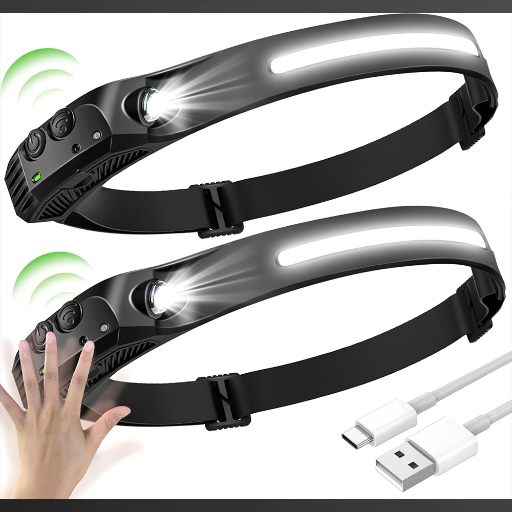 - 5 Convenient Working Modes Waterproof IPX4 – The head torch has 5 light modes of brightness: COB High/COB Low/XPE High/XPE Low/COB & XPE strobe. The head torch also has a unique sensor function design, just wave your hand in front of the head torch to turn it on/off. IPX4 waterproof can protect your head torch, you Don’t worry about rain