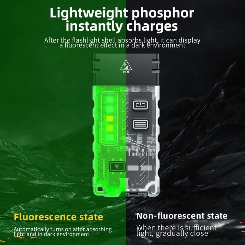 - Multifunctional Design: After the mini flashlight body absorbs light, it can display a fluorescent effect in a dark environment. When there is enough light, the fluorescent effect will be turned off. The small flashlight also has a high-decibel audible warning sound of up to 110DB.