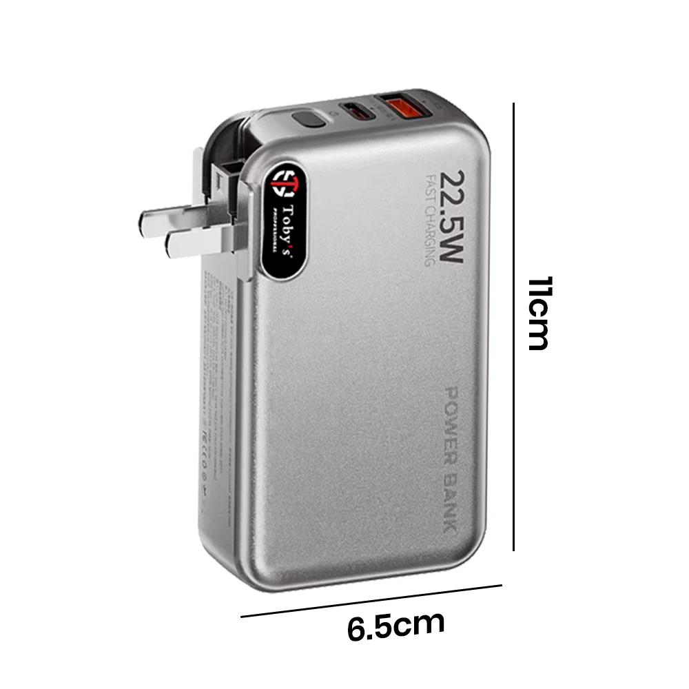 Toby’s PB-01 10000mAh Power Bank 22.5W Fast Charging 3 in 1 AC Charger with Built-in Lightning & Type-C Cables, USB-A & Type-C Outputs