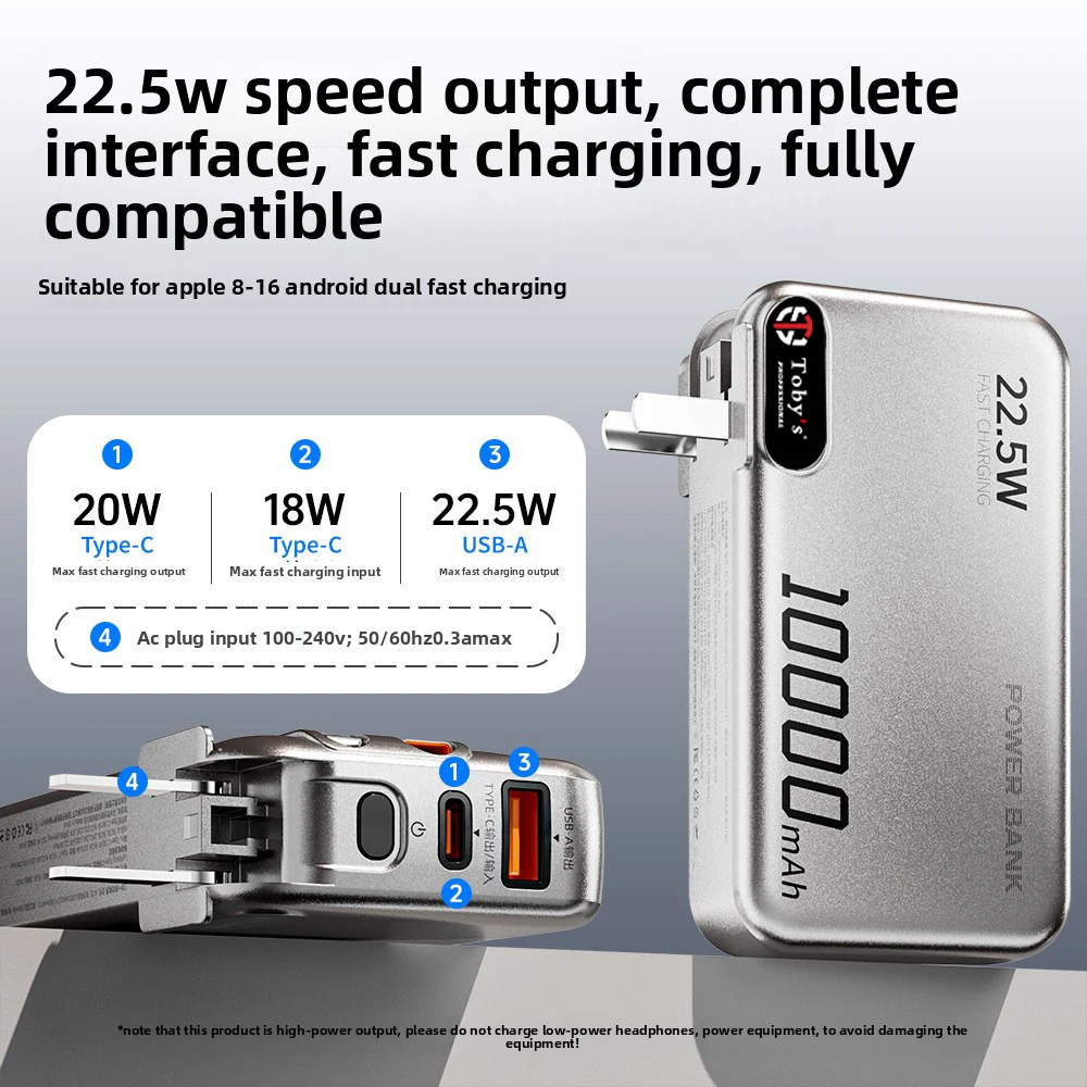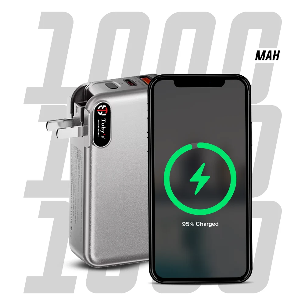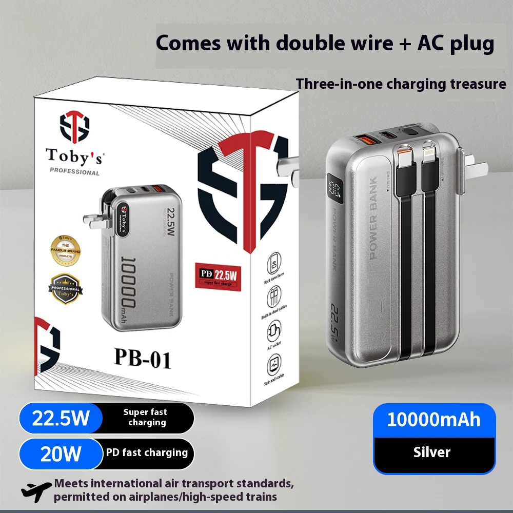 - Toby’s PB-01 10000mAh Power Bank combines the functions of a high-capacity backup battery, AC wall charger, and built-in cable organizer in one slim and compact design.
