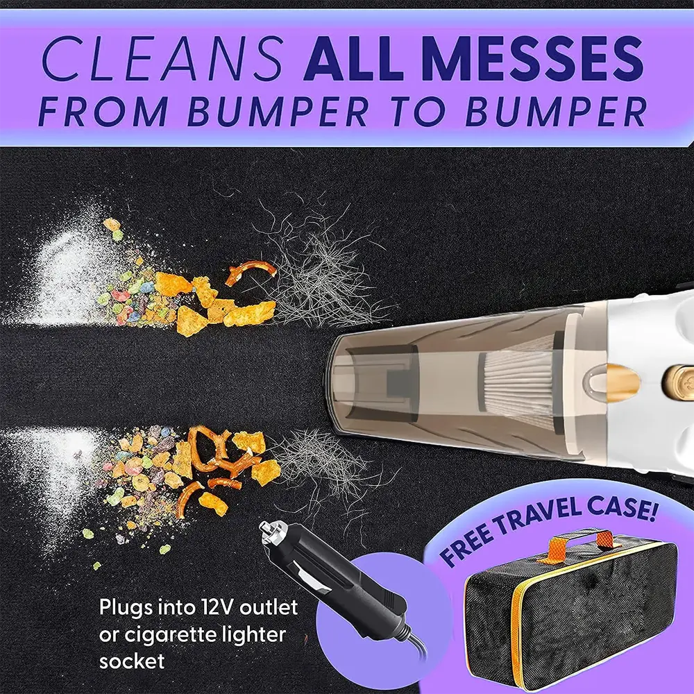 - This portable car vacuum cleaner is equipped with a brush nozzle, an extended hose, a slot pipette, a spare washable HEPA filter, which can meet the needs of high-efficiency suction and deep cleaning in different areas, even corners, and gaps.