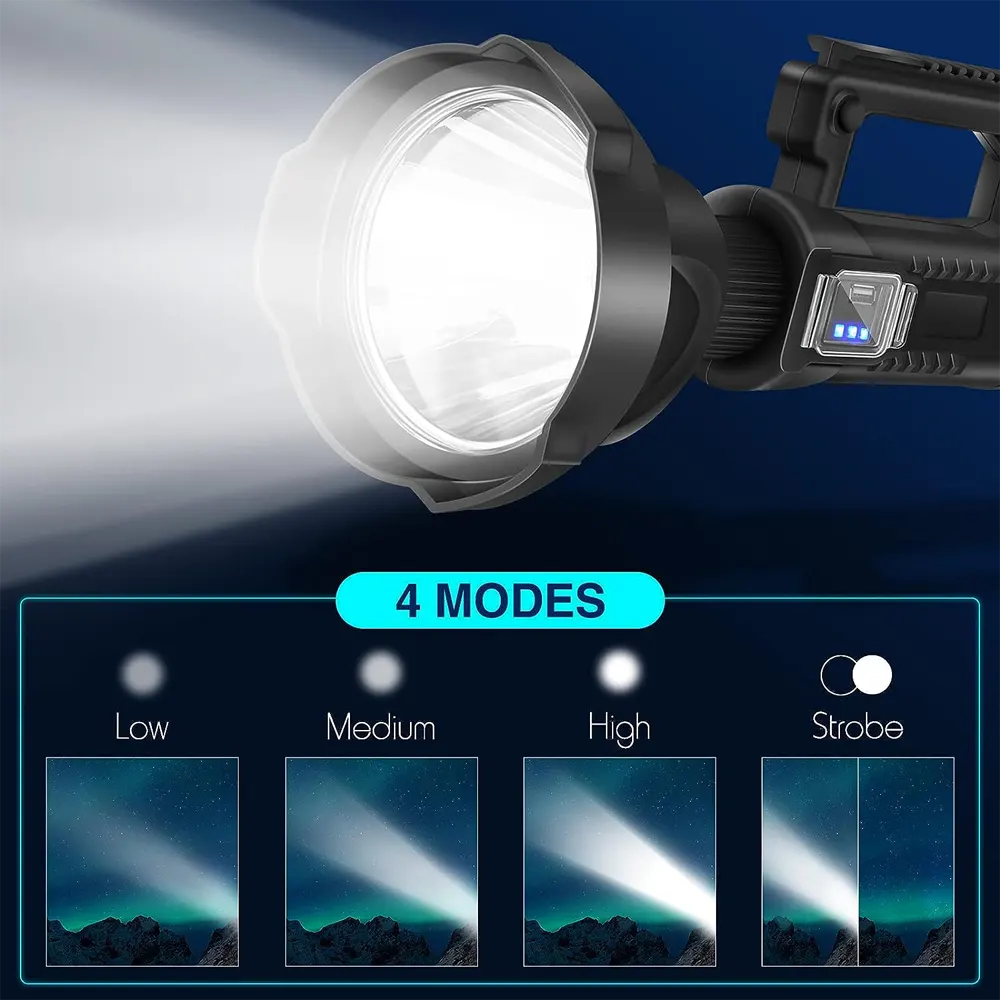 - LONG RUNTIME & 4 LIGHT MODES – 4 light modes: High-Medium-Low-Strobe. This rechargeable spotlight with built-in high-capacity power can run for up to 8-10 hours depending on different light modes, no need to worry about insufficient power