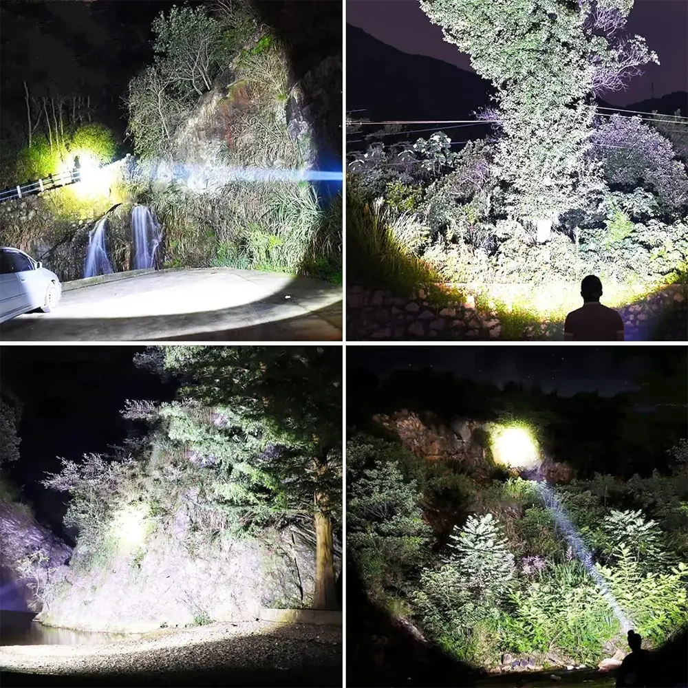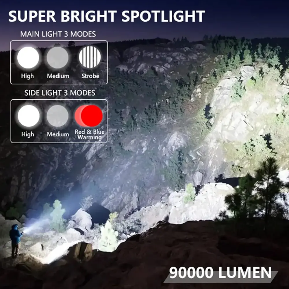 - [Powerful Spotlight] Super bright 90000 lumen(max) LED spotlight generates a brilliant focused spot beam whose illumination distance is over 2624ft/800m. Βattery life is over 100,000+ hours. Deepen the design of the large light cup, condensing and strong light for long-distance, convenient for lighting use.