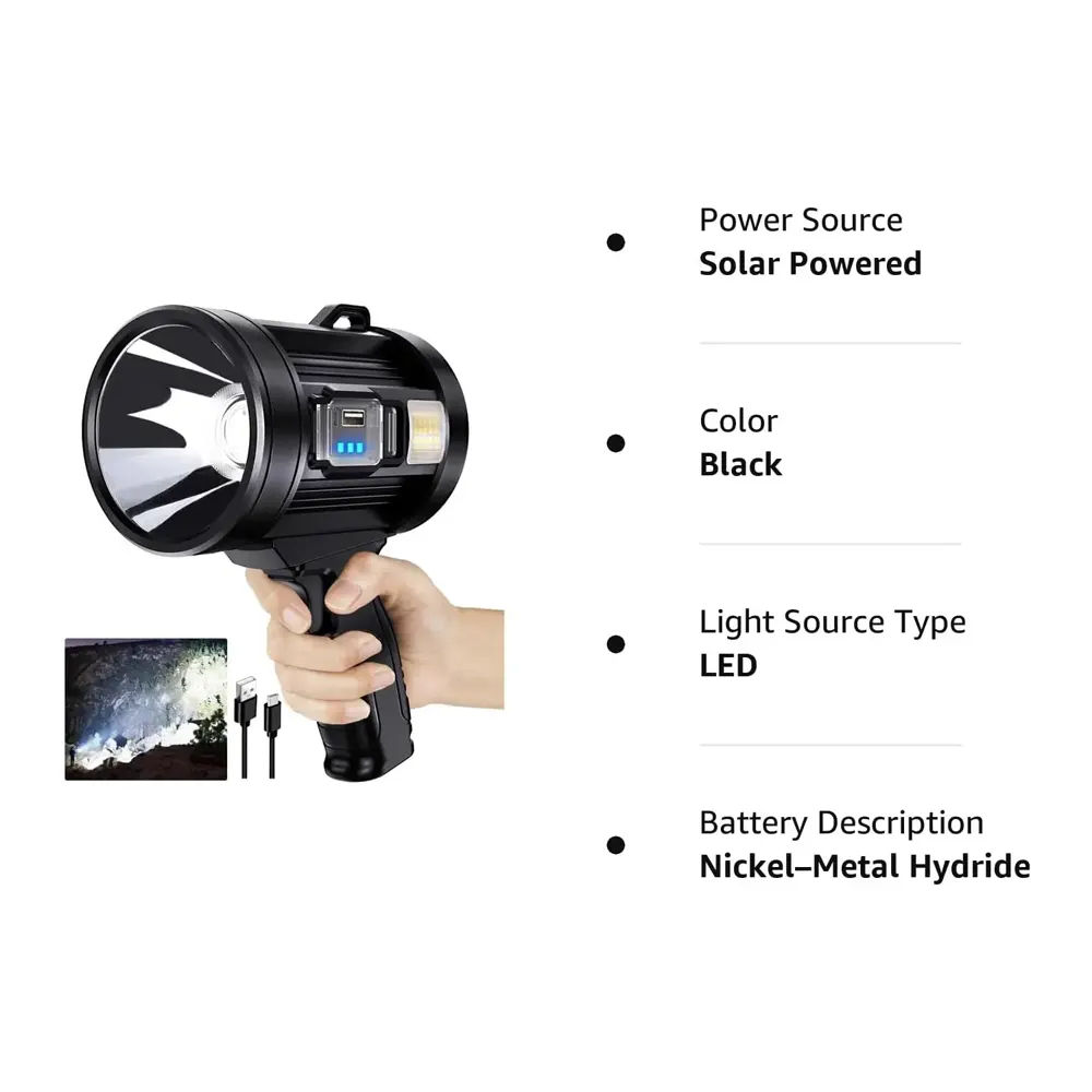 Toby’s Rechargeable Spotlight, 150000 Lumens Solar Flashlight Led Spot Light Outdoor Handheld with Cob Light, 3000mAh 4 Color 6 Modes Portable Spotlight Flashlight for Hunting Boating Marine