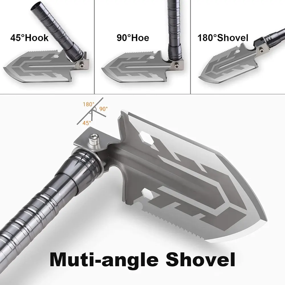 - Multifunctional tactical shovel with 45°/90°/180° adjustable angles.
