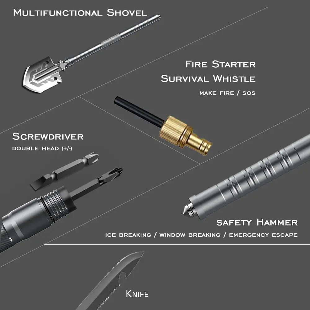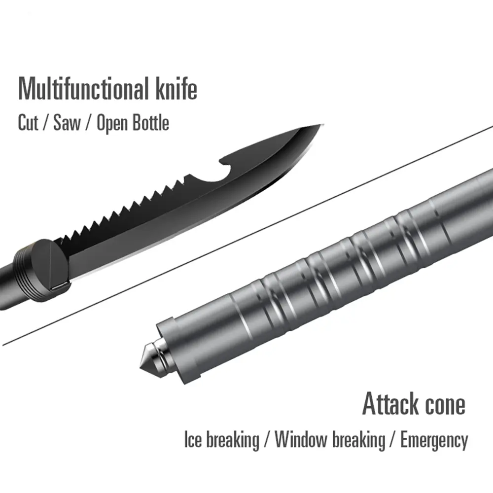 - Equipped with a detachable multi-function knife, it can be used for cutting, sawing wood, or even opening bottles, providing maximum utility in survival situations.