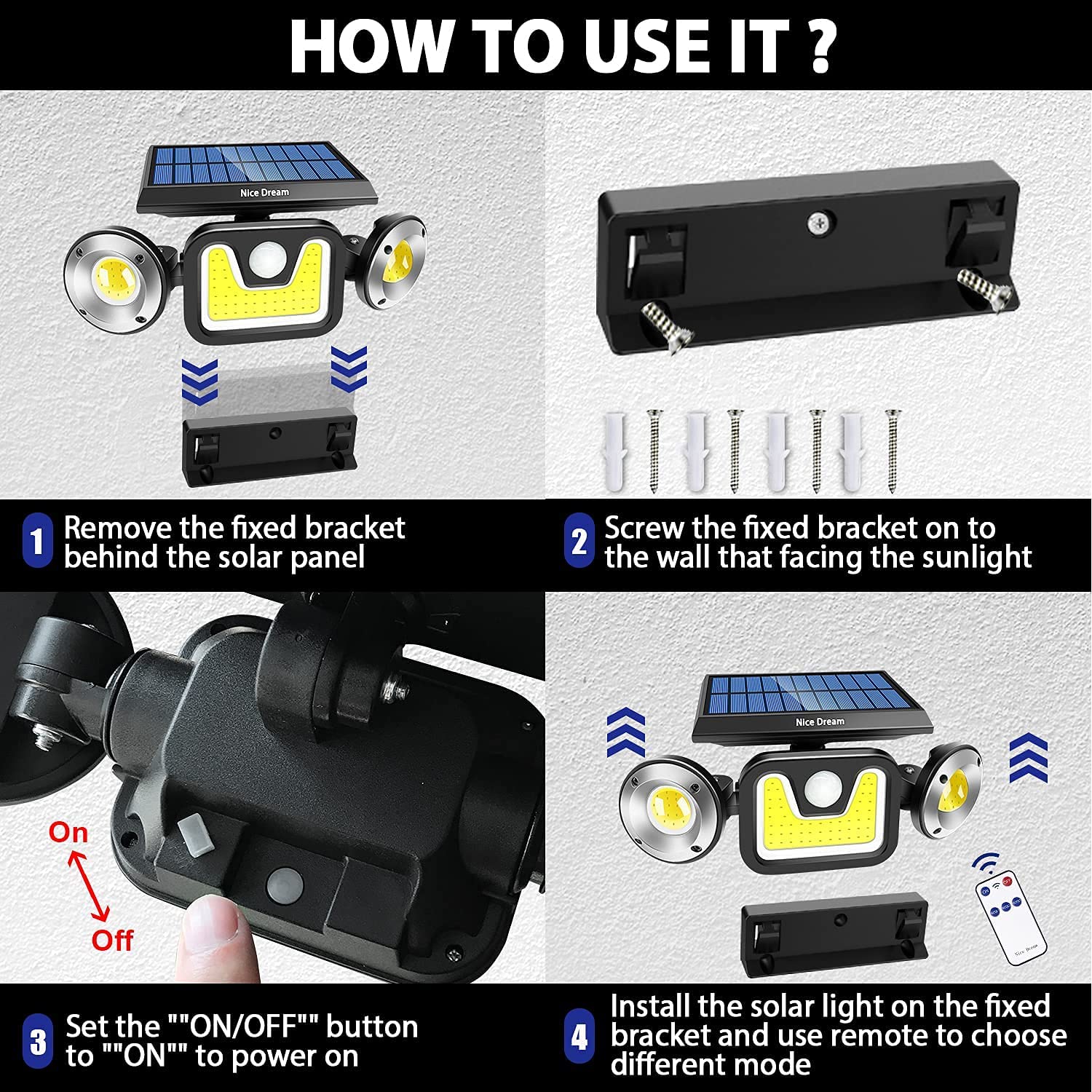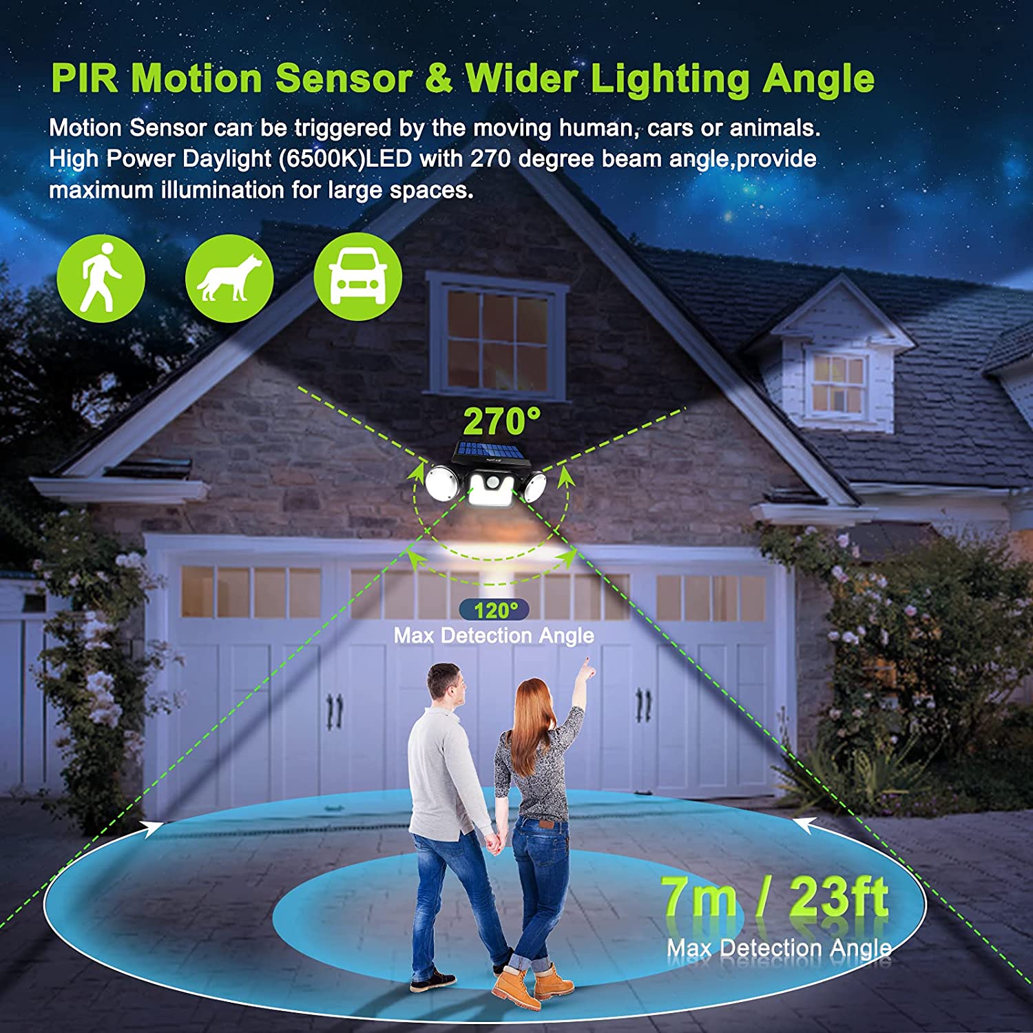 - mode 3 the light stay on 20% brightness at dark night without infrared induction. each mode can satisfy your need perfectly. 3-Head solar security light provides a greater light rotatable angle.